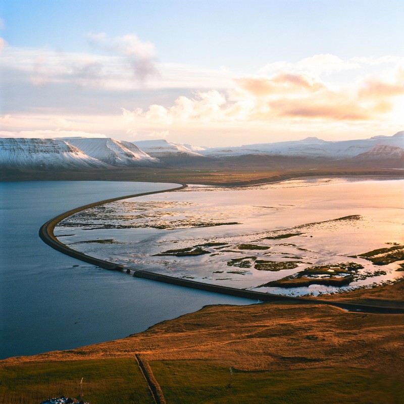 El puente: Este es el puente que lleva a la península llamada Króksfjar∂arnes, situada al noroeste de Islandia. Fue construido en 1997 y hoy en día es parte de la ruta principal de acceso a la región de Vestfir∂ir (Fiordos del Oeste). Króksfjar∂arnes forma parte de la comunidad de Reykhólareppur, donde viven alrededor de 250 personas. Hay cinco granjas de ovejas y una de las cuatro plantas de producción de mejillones del país.